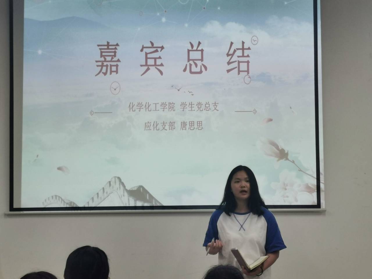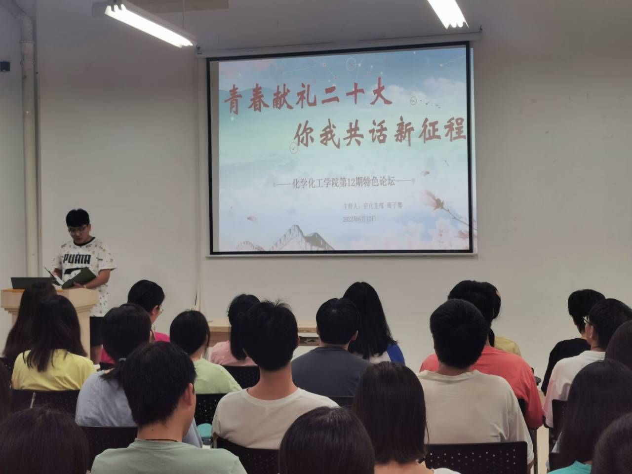 6月12日晚,化学化工学院学生党总支在工三B210举办第十二期学习论坛,本期主题为“青春献礼二十大,你我共话新征程”。论坛由应化支部周子骞主持,化学化工学院学生党总支唐思思同志出席,党员和积极分子代表共60余人参加。