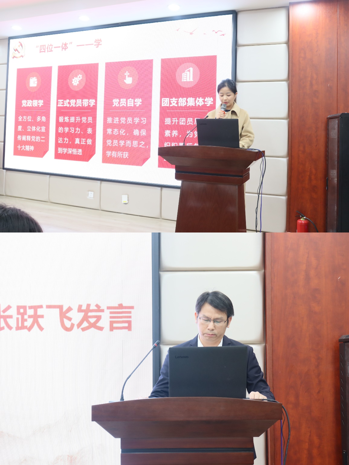(党建辅导员孙佳乐解读学习方案及学院副院长张跃飞总结发言)
