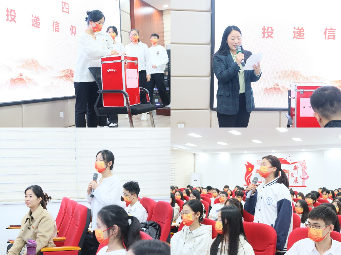 投递信仰信件,寄语未来的自己。每位党员和团员代表书写信仰邮件,对未来的自己作出期待与展望。信件宣读环节中,党员任梦萍在信件中写到:“希望我能用双脚踏遍祖国河山,体验不同民族、不同地区的特色,深切了解不同人民的需求,眼中有细节、有发展、有未来,无论我在何处、谋何事,希望能做精、做强,与祖国同呼吸、共命运。”。而党员刘璐在设想本世纪中叶时自己的家乡时说到:“大力促进的旅游业成为家乡财政的一大支柱,家乡所特有的千年古镇文化为大众所津津乐道,白墙红瓦的特色风古建筑也有来自世界各地的游客驻足观望,曾被周总理提名的雪峰蜜桔已经打开了国门,销往世界各地。”
