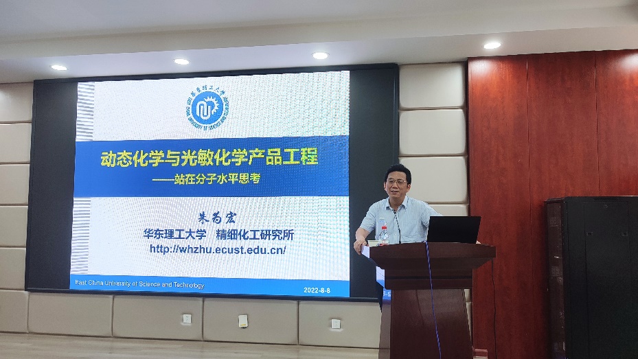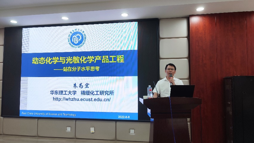 张跃飞对朱为宏进行介绍并表示热烈欢迎后,朱为宏以“站在分子水平思考”为副题切入讲解,分子结构是一切化学产品的根本,深入研究分子化学工程关乎产品源头性能的提升。他强调在校的科研工作者应当追根溯源,搞清楚分子结构不同而带来不一样的性质,弄明白分子结构改善带来的更优化的性能,并强化科技自信,从跟跑、并跑变为引领。他从所研究的光敏产品出发,从化学品分子结构角度为大家介绍了一系列光敏化学品功能化与稳定化,如高稳定性染料宏量制备方法、有机光敏剂纳米化宏量制备等。