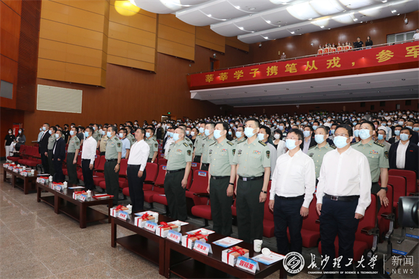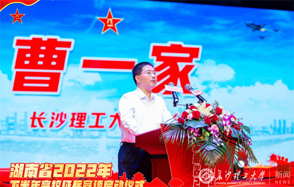5月18日上午,湖南省2022年下半年高校征兵宣传启动仪式在我校云塘校区大会堂隆重举行。湖南省军区副司令员、省征兵工作领导小组副组长陈博出席活动并讲话。长沙市委常委、常务副市长、市征兵工作领导小组组长彭华松,省军区动员局副局长、省征兵办副主任徐赞军,省教育厅二级巡视员李纪武,长沙市警备区司令员刘长进、政委冯紫英以及天心区政府有关领导,校长曹一家出席活动。