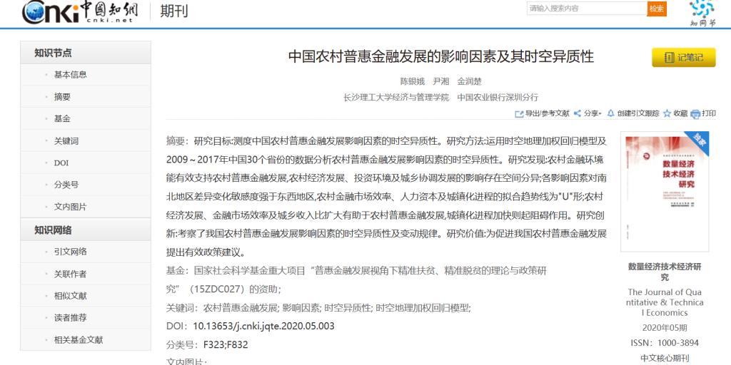 2020年5月,经管学院2018级应用经济学硕士研究生尹湘(第二作者)与导师陈银娥(第一作者)合作的论文《中国农村普惠金融发展的影响因素及其时空异质性》在权威期刊《数量经济技术经济研究》(2020年第5期)发表,是学院提高研究生培养质量的重要成果之一。