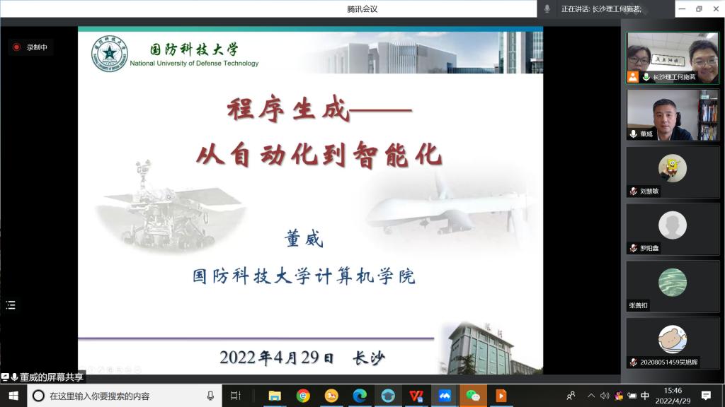 董威教授全面介绍了程序自动生成技术的发展历程和当前的研究现状。程序自动生成技术指利用某些技术自动地为软件生成源代码,达到根据用户的需求机器自动编程的目的。随后董威教授结合其科研团队近年来在基于代码大数据和群体智能的程序综合、基于反应式综合的无人系统控制程序生成等方面的研究进展,并着重介绍了基于网络知识汇聚和迭代式搜索的程序自动构造方法。最后,董威教授对程序自动化生成和智能化生成间的差异以及发展过程中涉及的一些问题进行探讨。