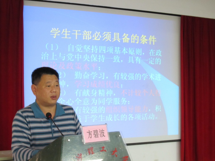 方碧波副书记充分肯定了分团校成立的意义和工作,并为全体成员上了团校培训班的第一节课——《加强能力素质培养促进学生干部队伍建设》。方书记分别从什么是学生干部、学生干部任职条件、学生干部的义务和权利、目前学生干部队伍存在的问题以及怎样成为一名优秀的学生干部等方面做了详细的介绍和说明,让同学们明确了作为学生干部的责任和义务,为同学们成长为优秀的学生干部指明了方向。最后,方书记向全体学生干部和广大同学提出几点希望:一,希望大家加强政治理论学习二,希望大家发奋学习,掌握科技文化知识,努力成才三,希望大家树立自立自强精神不断加强创新意识培养,以崭新的精神面貌迎接21世纪的挑战四,希望大家自觉培养奉献精神,努力营建良好的人际关系五,希望大家加强学生会组织自身建设 ,努力成为服务学生的新型纽带。