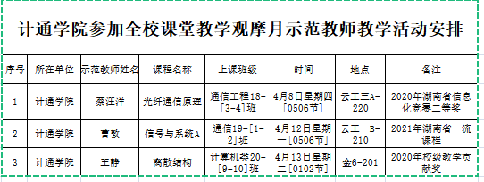 5、根据评估中心组织的“关于举办“教学观摩月”的通知”请各系积极组织教师参加学校的教学观摩活动,重点观摩我院推荐参加学校教学示范周活动的曹敦、蔡汪洋、王静三位老师的示范课程。
