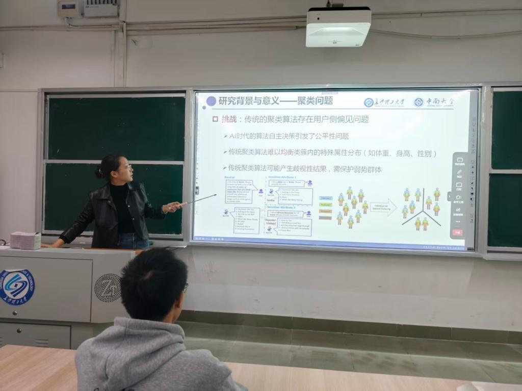 2025年11月3日下午2点,长沙理工大学金盆岭校区6教101教室举行了一场题为《公平聚类问题算法研究》的通识讲座。讲座由计算机学院武迪博士主讲,围绕数据挖掘中聚类算法的公平性问题与挑战,深入探讨了公平聚类的基本原理、研究进展以及当前在公平约束满足与算法效率方面面临的难题,并引导大家走近该领域的前沿方法与技术路径。