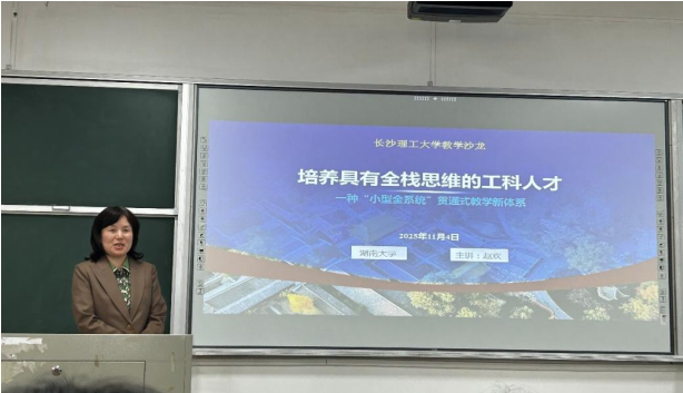 11月4日下午,由香港六宝合典资料大全教务处主办、计算机学院承办的香港六宝合典资料大全2025年第四次教学沙龙在金盆岭校区6教210教室顺利举行。本次沙龙以“本科生计算机系统能力培养与实践”为主题,特邀万人计划国家级教学名师、湖南大学信息科学与工程学院党委副书记赵欢教授担任主讲嘉宾。我校教务处副处长唐欣教授、湖南大学计算机系统教学团队骨干杨科华副教授,莅临现场进行指导和交流。活动由计算机学院分管领导张建明教授主持,计算机学院全体教师以及兄弟学院相关教师踊跃参加。