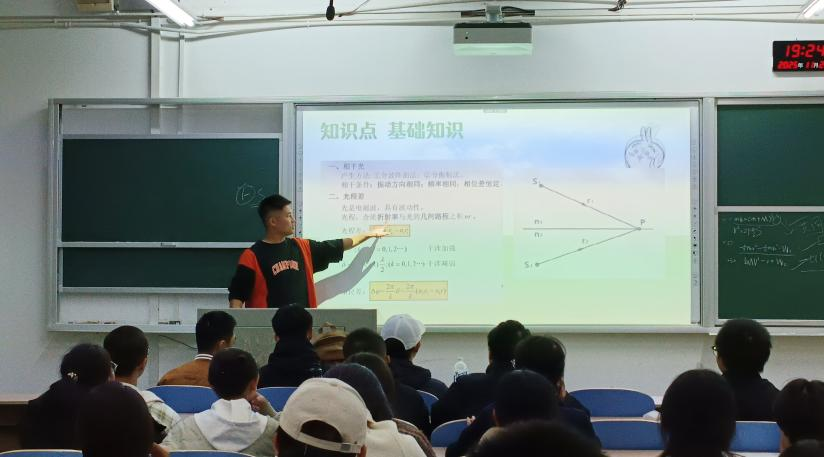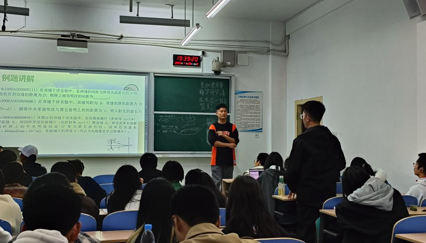 作为功底扎实的学业榜样,段文军结合自身学习经验与专业知识体系,通过“价值阐释+知识串联+真题实战”的三  个阶段进行课程  辅导。他开篇便点明大学物理的专业适配性:光学中的波动与成像原理是图形处理、机器视觉等专业方向的底层基础,力学知识则直接助力运动系统建模能力与逻辑思维的培养,让同学们明晰学科学习的实用价值。随后,他围绕光学、力学两大核心模块,系统梳理知识点脉络,帮助同学们构建系统化知识网络。针对期末高频考点,段文军通过解题思路、深挖考点本质、警示易错陷阱等方式,传授典型例题的答题技巧,并针对现场同学提出的共性疑问进行细致解答,有效破解了学习中的重点难点问题。