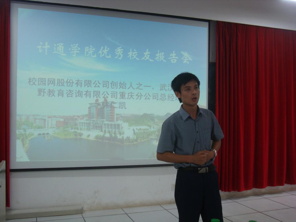 林仁凯,我校2010届毕业生,在校期间一直艰苦奋斗,敢于走出校园迎接挑战,发现机会,在本科生二年级时开始创建自己的事业。现为武汉新视野教育咨询有限公司重庆分公司法人代表,校园网股份有限公司创始人之一,两家公司注册资金分别为200万和1500万。