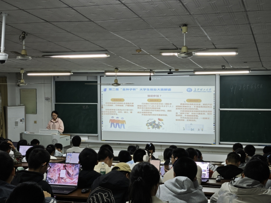 赛事平台推介,搭建实践桥梁。在赛事与平台解读环节,班主任及辅导员详细介绍第二届 “金种子杯” 大学生创业大赛方案。明确参赛对象、赛程安排、奖项设置及评审标准,结合往届计算机类优秀创业项目获奖案例,重点分析技术转化、团队组建、商业计划书撰写等关键要点,鼓励同学们发挥专业优势,组建跨年级、跨专业团队积极备赛。同时,全面推介学校大学生创新创业园(孵化基地)的资源优势,包括场地扶持、创业指导、技术对接、市场资源链接等政策,详细说明入驻申请流程与评审标准,动员有创业意向的同学借助平台降低创业成本,实现项目快速孵化。