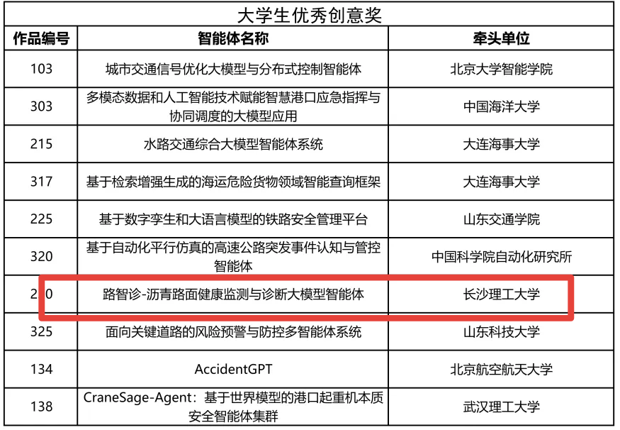 经过激烈角逐,由我校交通学院吕松涛教授团队报送的作品《路智诊-沥青路面健康监测与诊断大模型智能体》最终荣获“大学生最佳创意奖”。该大模型智能体由吕松涛教授、段海辉老师带领的博士生唐梓涵、硕士生张家瑞等共同研发完成。