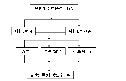 项目将以水泥为胶结材料,以纳米TiO2和碳化氮为自清洁材料,在一定条件下制备出生态新材料I型;以改性沥青为核心材料,以纳米TiO2和碳化氮为自清洁材料,在一定条件下制备出生态新材料II型,分别研究I和II型自清洁雨水快渗生态材料的相关特性,具体技术如下: