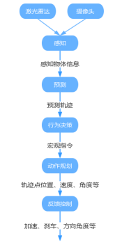感知模块负责从传感器数据中探测计算出周边环境的物体及其属性,这些物体信息经过预测模块的计算,生成预测轨迹传递给决策规划控制系统中的行为决策模块,动作规划模块负责具体的无人车的规划问题。反馈控制模块直接与无人车底层控制接口对接,负责消化上层动作规划的输出轨迹点,结合车身属性和外界物理因素的动力学计算,转换成对车辆油门、刹车、方向盘的信号,反馈控制模块主要涉及对车辆自身控制,以及和外界物理环境交互的建模。其流程如图2-8所示。