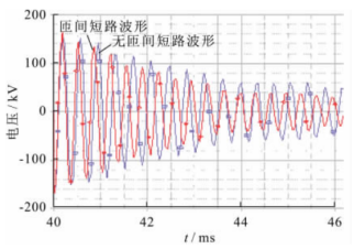 目前,利用脉冲电压法进行匝间绝缘检测时,所得到的均为电压的时域响应波形,如图5所示。有无匝间绝缘故障的时域波形并无明显变化特征,仅从响应电压的时域波形上无法判断匝间绝缘故障,需要对波形进行进一步处理。只有进一步分析时域波形的周期特性和衰减特性,通过对比试品电抗器在系统额定电压下和振荡波试验电压下两端的电压或电流波形频率及过零点变化,才能推断空心电抗器线圈是否存在匝间绝缘故障。