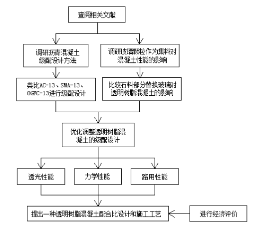 采用理论分析与室内试验相结合、数值模拟与效能评价并行的研究方法,提出一种透明树脂混凝土的配合比设计及试验研究方案。系统开展透明树脂混凝土最优级配设计、集料选择,着重研究废旧玻璃作为透明骨料对透明树脂混凝土透光性能、力学性能和路用性能的影响。技术路线见下图: