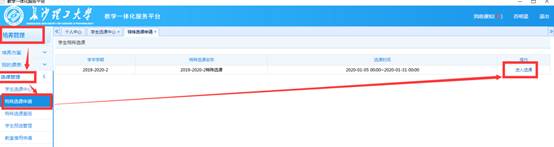 2、 进入特殊选课申请界面:【培养管理】---【选课管理】---【特殊选课申请】,点击【进入选课】: