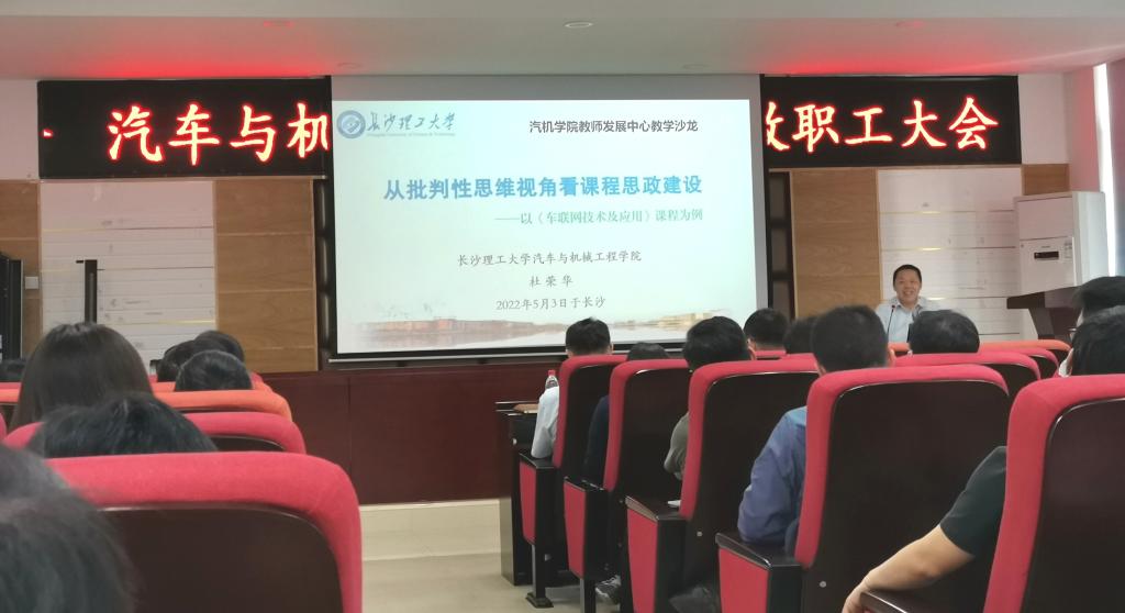 5月3日下午汽车与机械工程学院教师发展中心在工科一号楼B417会议室举办了教学沙龙活动。活动由学院党委书记施一满主持,院长杜荣华作《从批判性思维视角看课程思政建设》专题报告,学院全体教师参加。