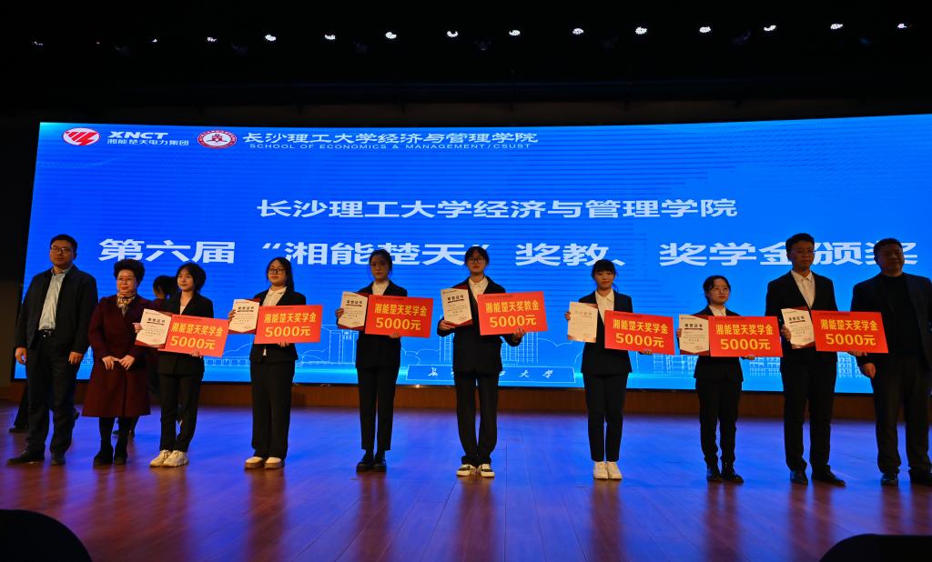 经管学院副院长刘坚宣读了获奖名单。颁奖后,获评优秀专业教师的李祝平教授在发言中表示了对湘能楚天电力集团的感谢,她倡议教师们在人工智能时代坚守育人初心,不断探索新的教学方法和手段,产生教学与科研相长的协同效应。获评优秀思政工作者的辅导员王宝宝老师分享了自己以热心、耐心、责任心对待学生工作以及对标榜样努力提升育人水平的成长经历。获评自强之星、学习之星、志愿服务之星、科创之星的16个奖学金团队及个人分别讲述了学习与成长的奋斗经历。他们全面发展、创先争优、心怀感恩,获奖背后的一个个生动的故事赢得了在场师生的热烈掌声。随后,经管学院教师申立平、王玉等表演了旗袍秀《水韵江南》,学生们表演了舞蹈《万疆》。