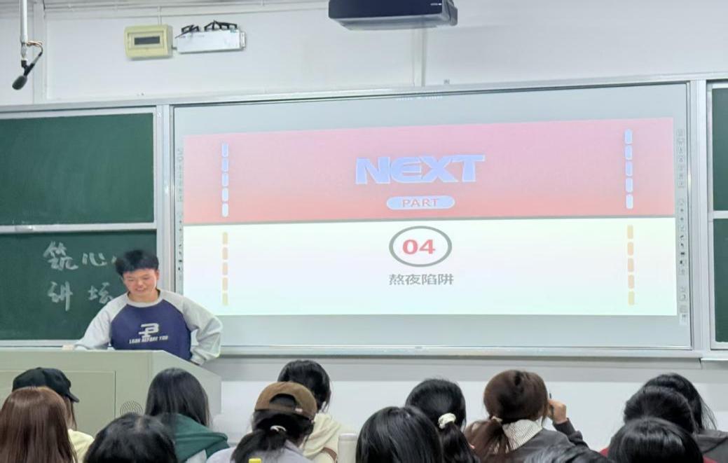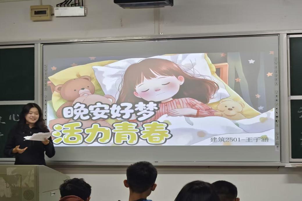 在活动过程中,宣讲员和观众积极互动,活动氛围生动活泼,很多新生都对宣讲员的宣讲产生兴趣并获得了大学心理问题的解决办法。“筑心讲坛”不仅是一次睡眠宣讲,更是学院心理育人工作的重要一环。宣讲员的倾情分享,如同为新生们构筑起一根根承重之“梁”,这些关于学业、社交与生活的宝贵经验,支撑着大学高质量的睡眠与内心的安宁大厦。