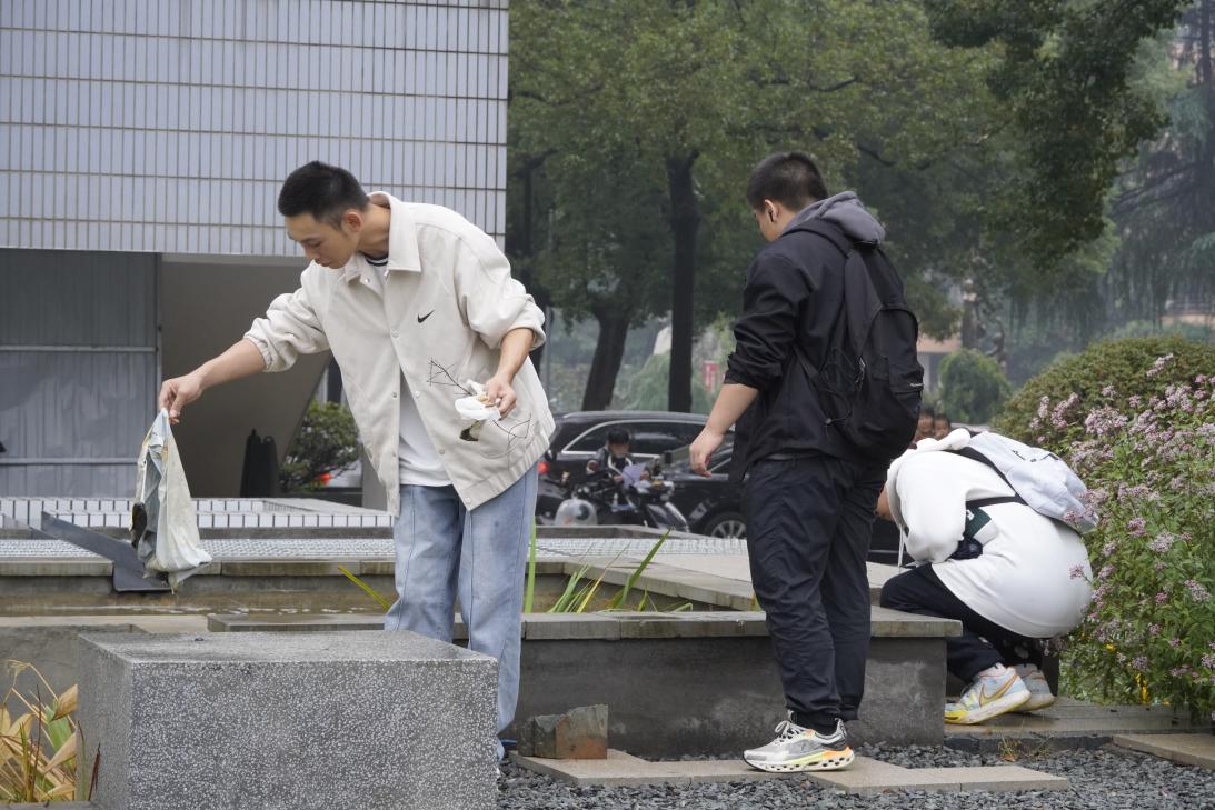 (学生清理水池旁的垃圾)