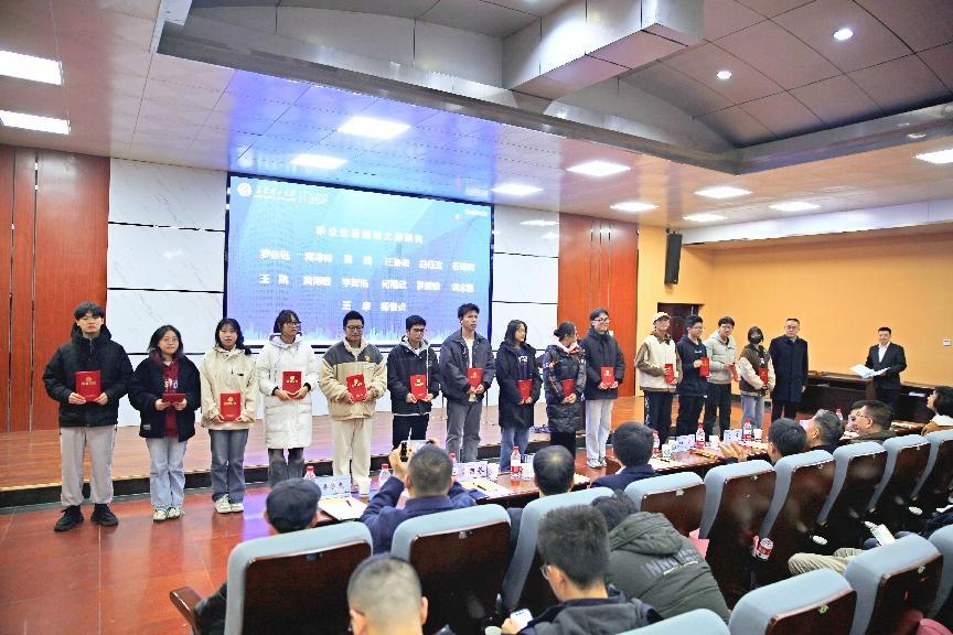 在颁奖仪式环节,上海宝业集团总经理、建筑学院校友分会会长夏峰,湖南中地智合规划建筑设计有限公司执行董事、总经理李朝芬,长沙卓之越教育咨询有限公司胡智华,建筑学院常务副院长许建和,建筑学院副院长周晨,分别为第四届建筑梦想奖学金、职业生涯规划大赛、“我的校园我做主”校园更新设计竞赛、乡村振兴规划设计大赛获奖代表颁奖。