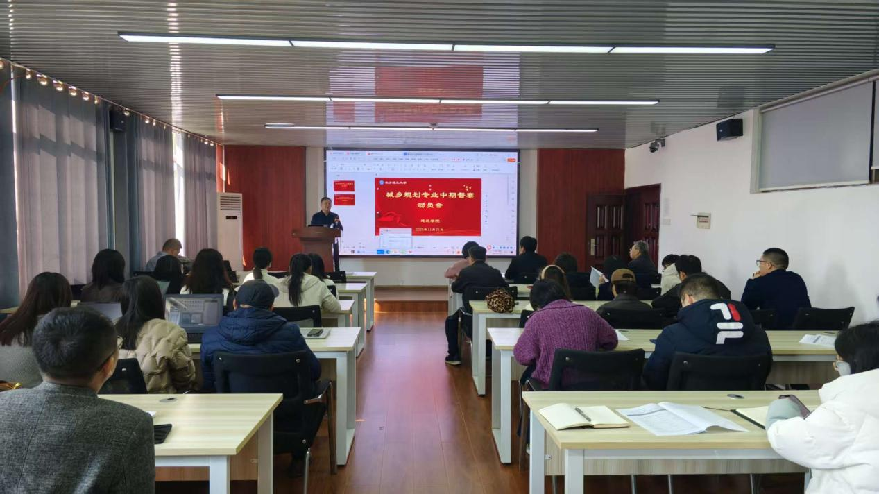 2025年11月21日上午,建筑学院在第十六教学楼314教室召开城乡规划专业中期督察动员会。学院领导班子成员、城乡规划系全体教师、各系主要负责人,以及党政办公室、科研办公室、教务办公室、学工办等相关职能部门教师参加会议。会议由副院长周晨主持。