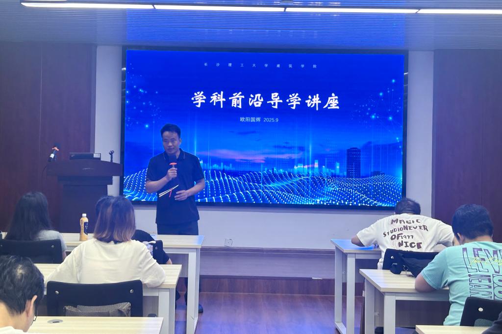 918日上午,建筑学院在金盆岭校区16号教学楼314教室举办了主题为学科前沿导学的专题讲座。本次讲座由建筑学院党委副书记肖义慧主持,特邀国家一级注册建筑师、湖南省建筑师学会理事、湖南省设计艺术家协会理事、我院欧阳国辉教授担任主讲人,2025级全体研究生新生共同参与聆听。