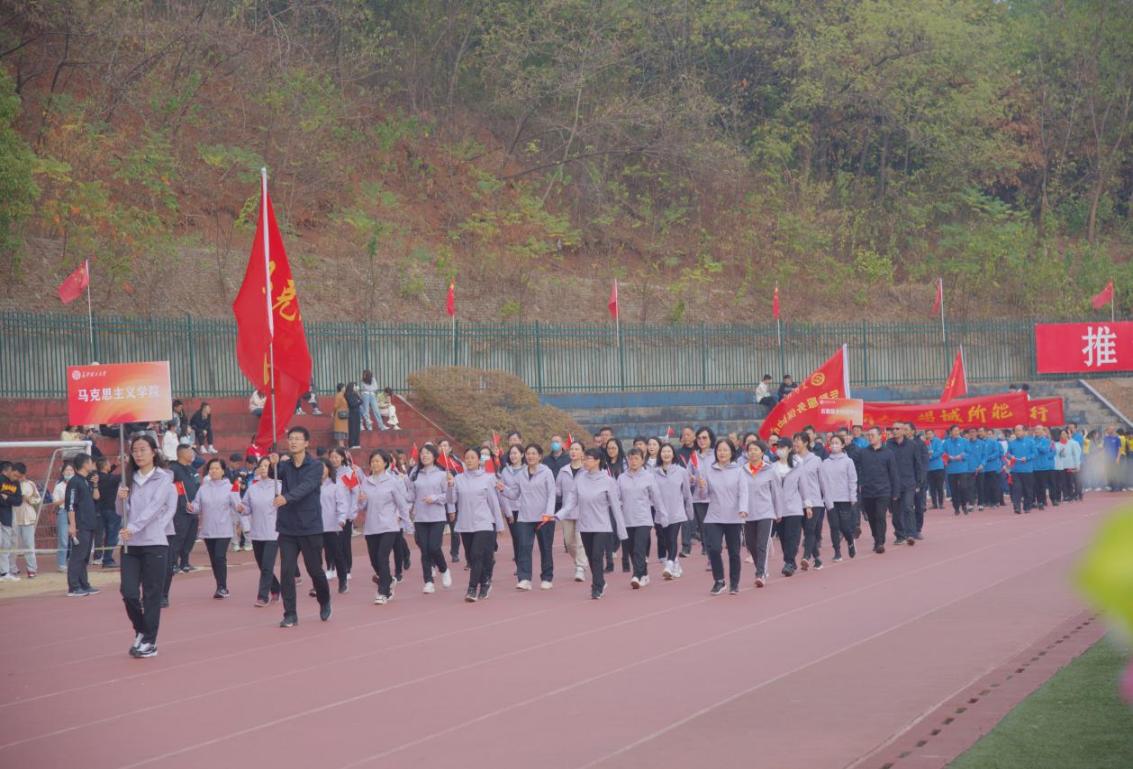 为了充分展示学院教职工团结严谨、内外兼修的良好风貌,学院分工会文体委员钟芙蓉和张小慧等老师多次考察市场,为学院教职工精心选购和搭配了运动服饰。在11月4日上午举行的开幕式上,学院60多位教职工组成马克思主义学院方阵参加了入场式。大家精神抖擞,步伐整齐,“一马当先”的口号铿锵有力,“重点马院”的风采闪耀全场,彰显了踔厉奋发、勇毅前行的精神风貌,赢得了全场师生的高度赞扬。