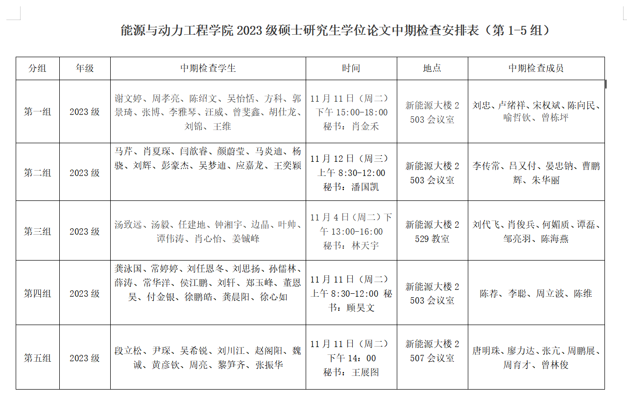 能源与动力工程学院2023级硕士研究生学位论文中期检查安排表(第1-5组)