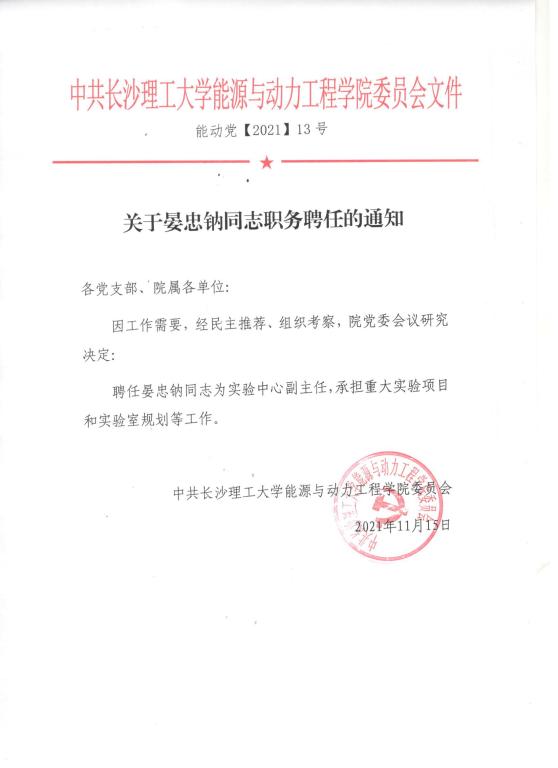 关于晏忠钠同志职务聘任的通知