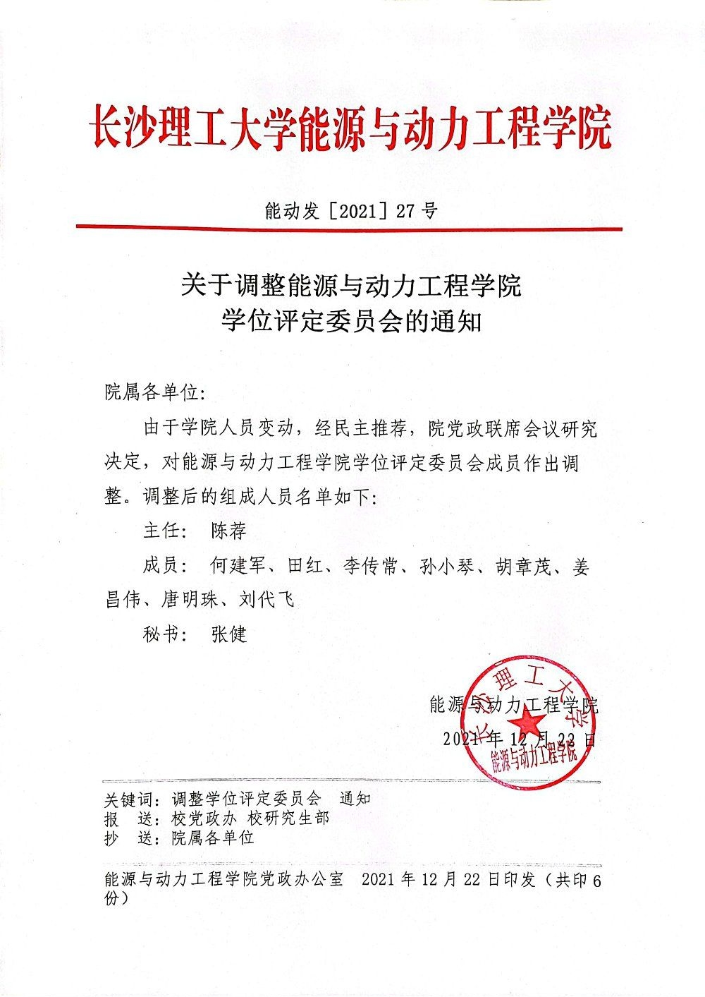 关于调整能源与动力工程学院学位评定委员会的通知
