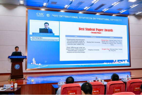 10月17日上午,大会在完成所有学术报告和学术活动之后,温建锋宣读了本次大会最佳学生论文、最佳海报等奖项。涂善东院士做了大会总结报告,点评了部分重要学术报告,总结了本次报告的关键词,梳理了本次学术会议的创新点,指出了重大基础设施的结构完整性领域的发展方向。据悉,下一届会议将由中国结构完整性联盟和英国结构完整性联盟联合举办,时间为2023年5月23至25日,地点为英国索尔福德(Salford)。来自英国结构完整性联盟的John Sharple介绍ESIA17/ISSI2023的会议计划。会议在热烈的掌声中圆满结束。