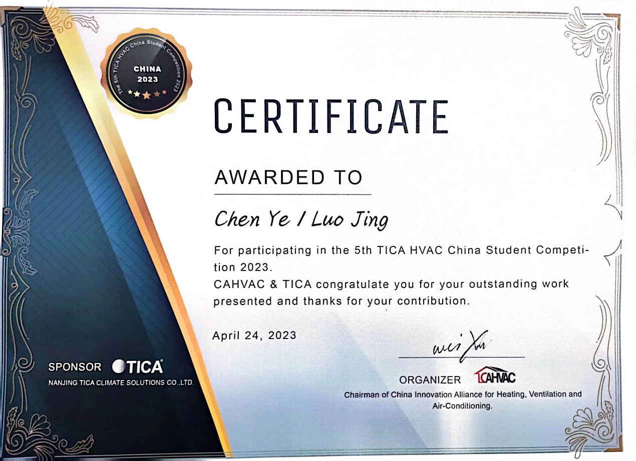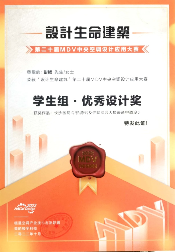 本年度,我院师生在暖通空调行业赛事中取得了优异成绩。我院教师唐海兵和王蒙分别指导建环专业本科生栾俨丁、伍晴和彭腾荣获第二十届MDV中央空调设计应用大赛学生组·优秀设计奖。我院教师王蒙荣获第四届全国建筑环境与能源应用工程专业青年教师讲课技能竞赛专业基础课二等奖。我院研究生陈烨参加了第五届“天加杯”全国暖通空调学生科技竞赛。