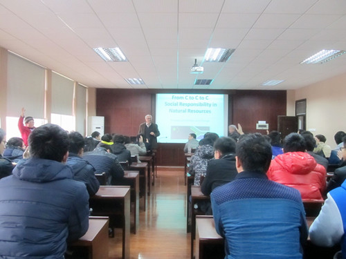 Beyer教授幽默生动的讲述风格一开场就引得老师和同学们掌声连连,教授先介绍了德国的15年的新能源发展过程、全球有代表性地区的能源现状以及关于新能源发展的设想,分析了新能源在部分地区没能发展起来的原因。Beyer教授特别对在座的同学说:你们毕业就将前往各能源公司工作,要充分利用你们的智慧,保护地球的能源,因为这是你们也是每个人对于社会对于自然对于下一代应尽的责任!