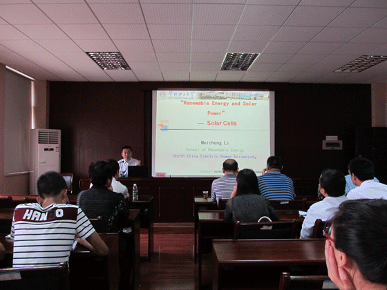 聘任仪式结束后,李美成教授作了一场题为“Renewable Energy and Solar Power -Solar Cells”的精彩学术报告。能动学院相关专业师生参加了此次报告会。李美成教授结合自己的求学和科研经历,从环境保护的角度,引出当今社会的发展对可再生能源的迫切需求,并介绍能源可再生能源发展现状;同时,展示自己科研团队近年来在新能源材料领域取得的原创性成果,引起与会人员的浓厚兴趣。学术报告结束后,李教授与在场师生进行了充分的交流,与会师生感到受益匪浅。本次学术讲座在热烈的掌声中圆满结束。