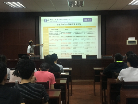 会上,刘忠博士从学校学院概况、研究生招生和研究生培养三个方面进行了详细的介绍,重点介绍了学院的学科情况、科研平台、研究方向以及导师队伍等情况。他根据近几年研究生招生政策的变化情况对2016和2017连续两年的研究生招生数据进行了细致的分析,并对全日制研究生和非全日制研究生进行了对比说明,以此帮助同学们理性定位,为同学们选择考研学校提供具体建议。最后,刘忠老师现场回答了同学们提出的问题。整个宣讲会在轻松的环境下进行,对同学们日后的考研准备具有较好的指导意义。