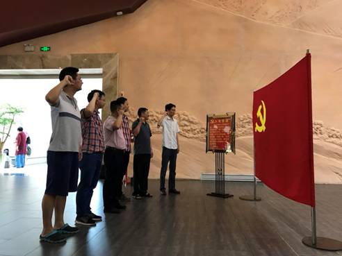 随后在纪念馆宣誓厅,面对鲜红的党旗,支部全体党员高举右手、紧握拳头,重温入党誓词,宣誓共产党人坚定的理想信念。