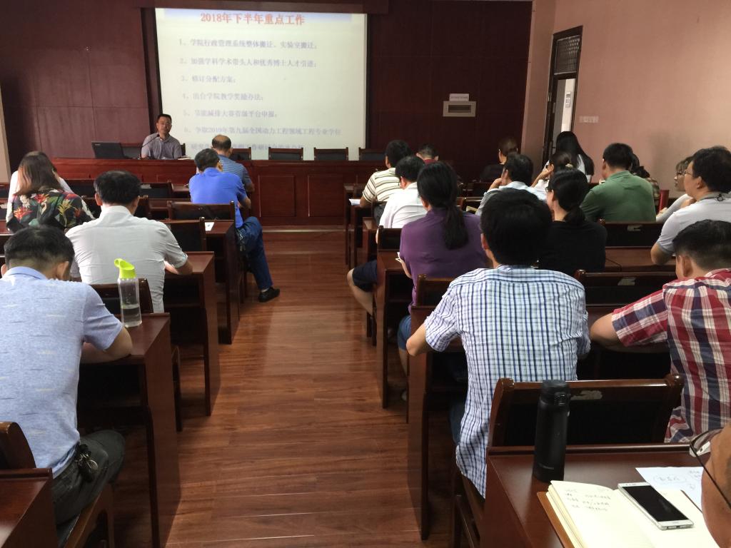 陈院长对2018年下半年学院将要开展的10项重点工作进行了布置,分别是:学院行政管理系统整体搬迁、实验室搬迁;加强学科学术带头人和优秀博士人才引进;修订分配方案;出台学院教学奖励办法;节能减排大赛省级平台申报;争取2019年第九届全国动力工程领域工程专业学位研究生教育协作组工作研讨会的承办权;动力工程及工程热物理和动力工程2个学位点合格评估;围绕学位点申报,以问题为导向,加强学科建设;加强与政府、企业及科研院所联系与合作,加强学术交流,提升科研实力;根据学校安排,进行专业技术人员岗位考评。