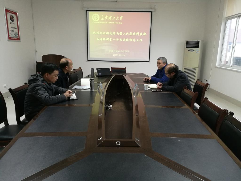 3月25日下午,湖南兵工集团科研部马援晖部长应邀来我院开展科研合作交流,学院党委书记陈冬林,唐明珠、周育才、曹文广博士参与交流,陈冬林介绍了我院科研建设成就以及学科研究优势;马部长介绍了兵工集团历史沿革,结合湖南兵工集团亟需解决的炮弾烧蚀、复杂作战环境下装备相关技术、火工企业生产线智能化改造、设备智能诊断与维修、轻武器使用维护的虚拟现实等方面开展技术交流,双方达成了合作意向。