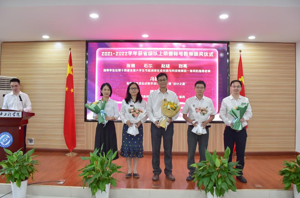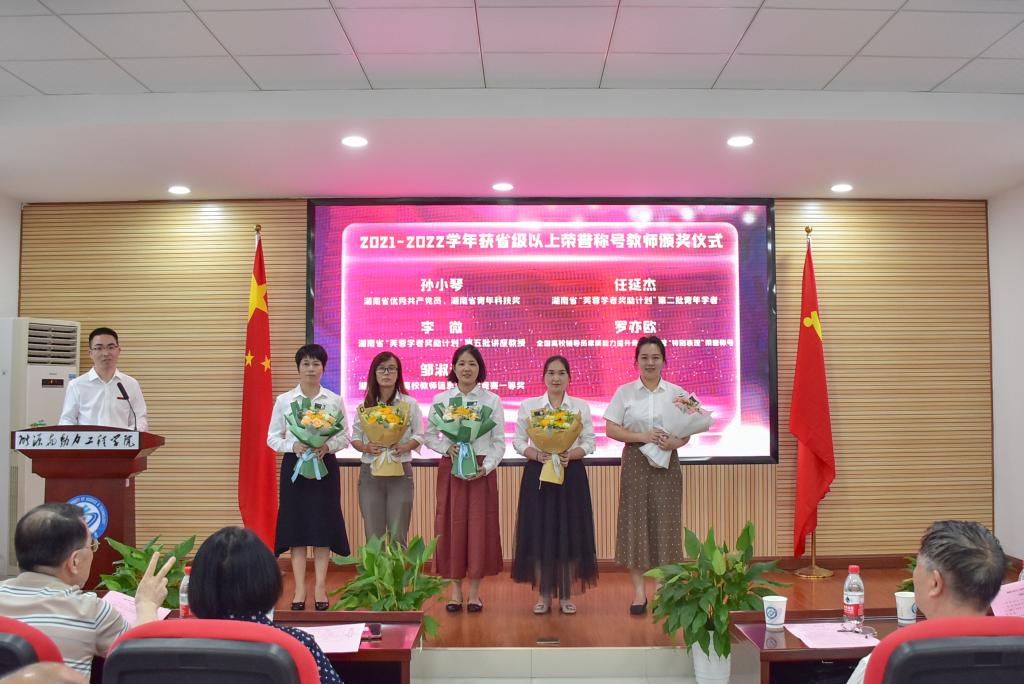 此次表彰大会分两轮颁奖,首先举行2020-2021学年获省级以上荣誉称号教师颁奖仪式,并邀请获奖老师上台,学生代表为获奖老师献花。认真细致,追求卓越,老师们在各自的领域不断思索研究,攻坚克难,并获得一个又一个卓越的荣誉。