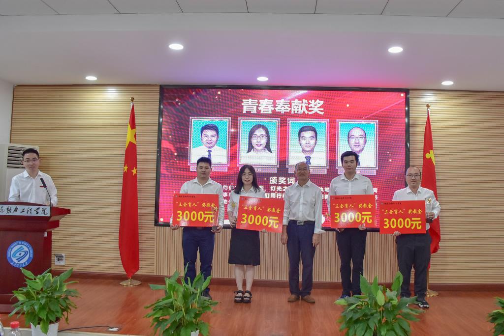 获奖老师依次上台领奖,校友和学院老教师为获奖老师颁奖。老师们手中的奖杯既是沉甸甸的荣誉,也是一代代能动人薪火相传的“接力棒”。正如颁奖词所述,老师们在科研领域久久为功,在教育方面春风化雨,以奉献与无私写满青春,以成果与桃李添彩人生。