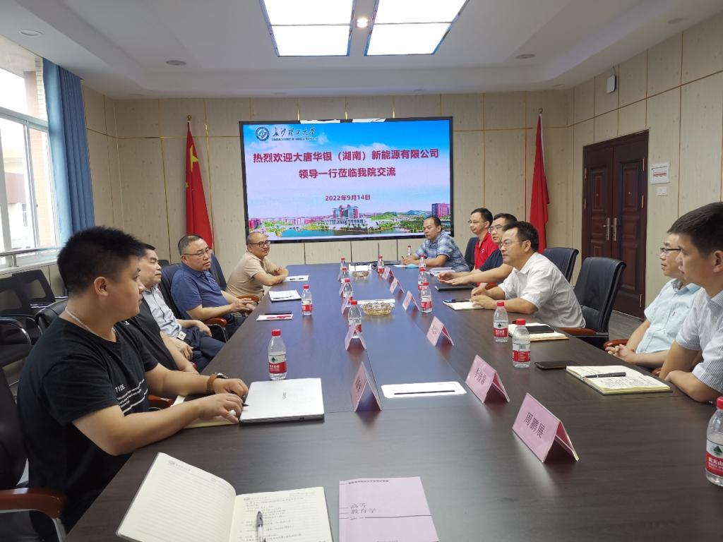 2022年9月14日下午,大唐华银(湖南)新能源有限公司总经理彭朝晖,以及冯高煜、周勇、黄新华等领导、专家莅临我院开展技术交流与合作洽谈,我院党委书记成华、院长陈荐,副院长何建军、李传常以及彭卓寅、唐明珠、周鹏展、陈康等教师参与交流,交流会由陈荐主持。