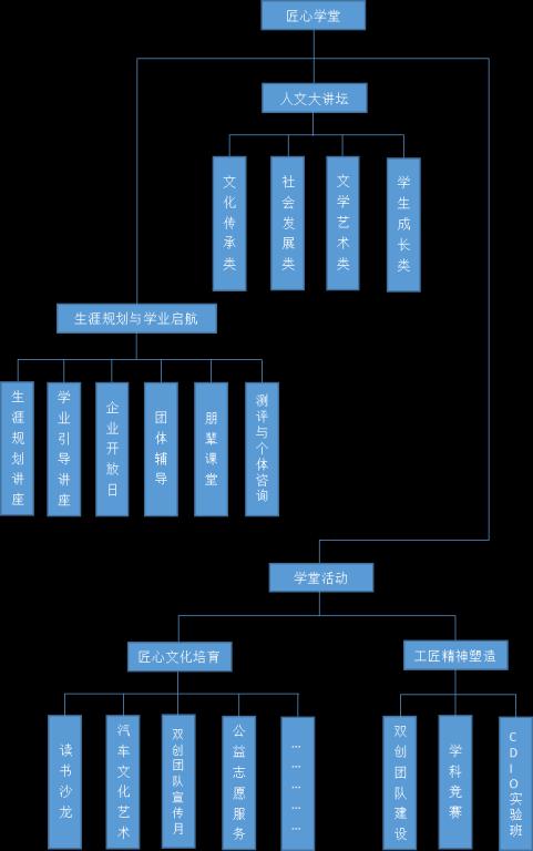 在学习、借鉴现有较为成熟的三种书院模式,即以北京大学元培学院为代表的精英模式、以华东师范大学孟宪成书院为代表的大众模式和以香港中文大学为代表的传统模式的基础上,考虑汽车与机械工程学院机械大类学生学科的相对单一性和四年培养的一贯性,参考香港中文大学的传统模式,为学生贴上两张标签,一张是学院的,一张是学堂的,学院的主要职责是开展“学科为本”的教学,学堂则负责提供“学生为本”的教育。学堂提供包括通识教育讲坛、读书沙龙等众多“第二课堂”活动机会,与“第一课堂”教育一同培养学生的文化品位、自信心、责任感、人际关系技巧等。