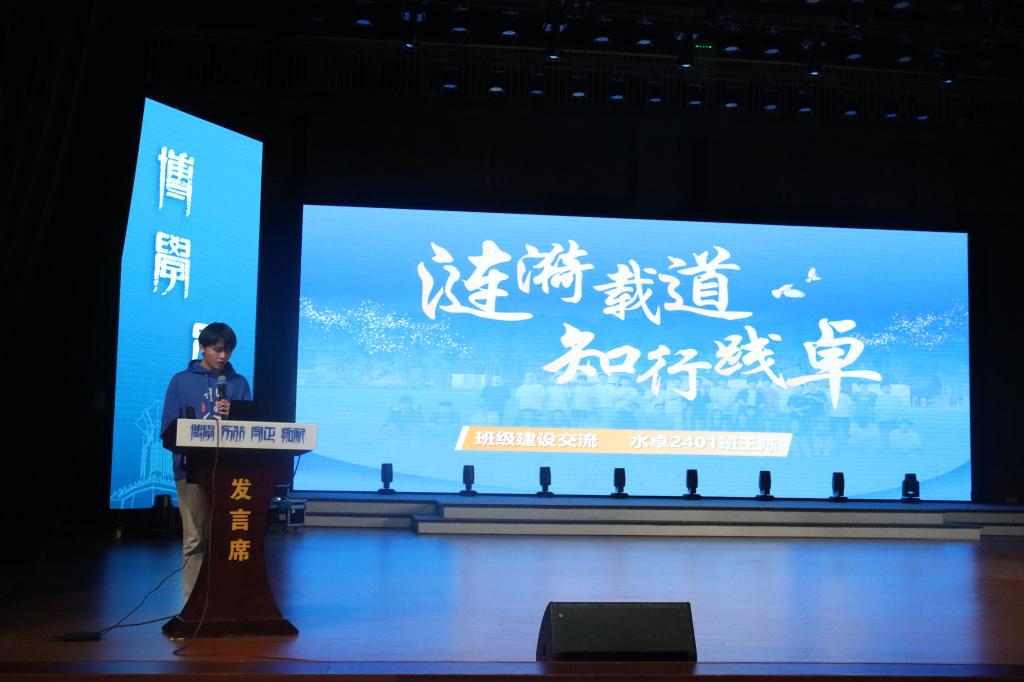 在学生代表分享环节。水卓2401班王陈以“涟漪载道,知行践卓”为主题,从思想引领、学风建设、实践育人、文体融合四方面,系统介绍卓越班集体建设路径;李诗然围绕“润知卓行,阅起涟漪”,详述书香班级营造策略,强调“润物无声、涟漪绽放、知行合一”的阅读生态构建;水文特岗2401班杨钶则以“水漾创新,赛场扬帆”为题,分享跨学科科创思路、竞赛策略与心态调适方法,助力新生拓展创新视野。
