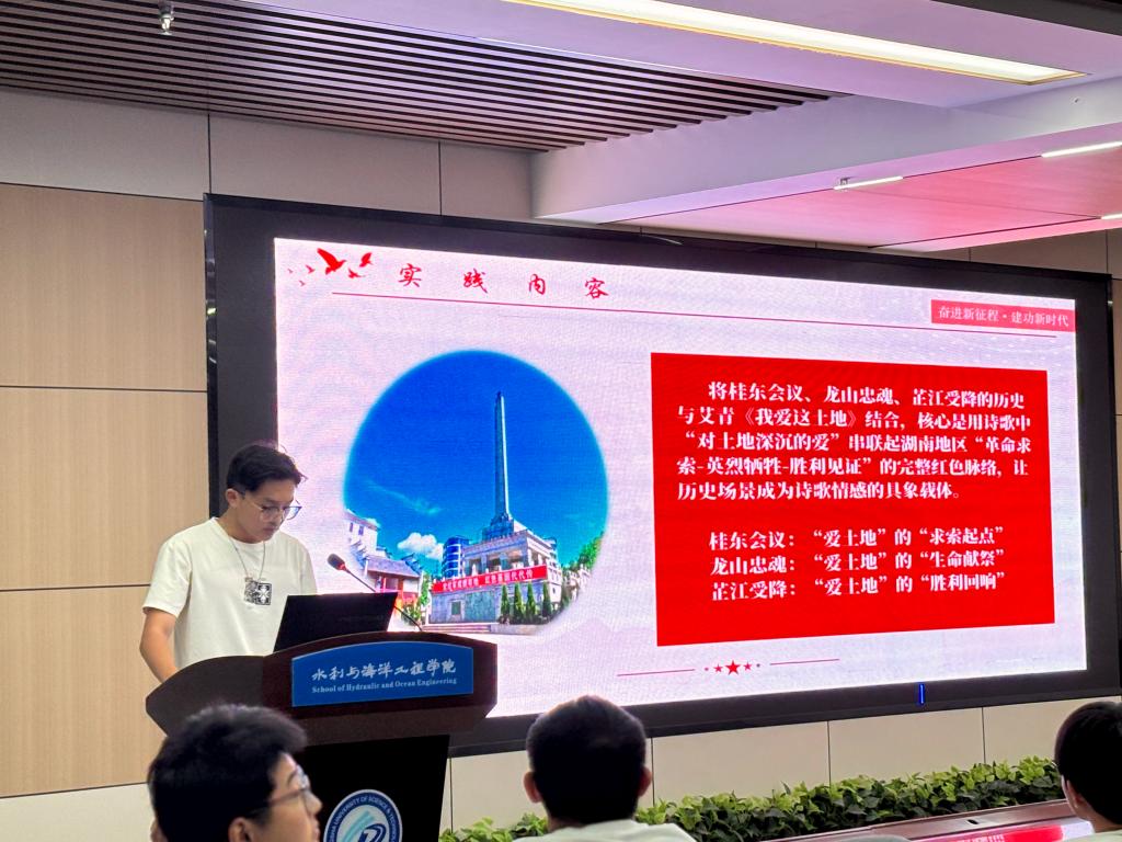 活动伊始,四个实践小组的代表依次分享了暑期实践的成果与感悟。张富翔小组走访唐家大屋、龙山烈士陵园与芷江受降纪念馆,通过追寻红色足迹,深入体会毛泽东同志的领导智慧、革命先烈的忠诚精神以及抗战胜利的重大历史意义。李晨浩小组前往长沙博物馆,选取三件代表性文物,结合专业背景编写通俗易懂的文物档案卡,生动阐释湖湘文化的深厚底蕴。邹欣辰小组赴韶山灌区开展实践,通过实地调研、座谈交流和科普宣传,全面了解灌区建设历程,深刻认识到新时代水利工作者的使命与担当。敬甲琪小组走进云塘社区党群服务中心,以动画和手绘形式为孩子们讲述赵一曼、雨来等英雄事迹,开展“铭记抗战精神”主题宣讲,在童心中播撒红色种子。