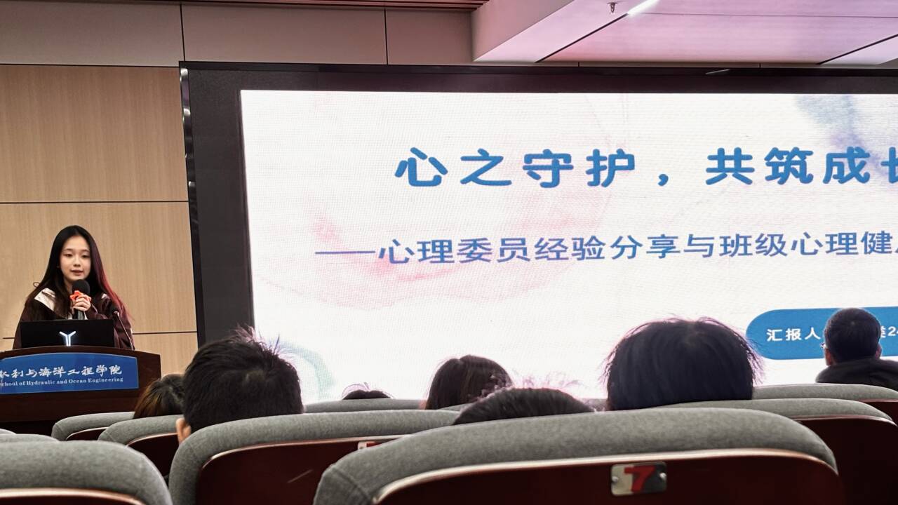 为提升心理委员履职能力,健全班级心理健康防护体系,助力同学们身心健康发展,11月21日晚,水利学院在新能源大楼一栋二楼会议室举办2024级心理委员经验分享交流会。本次培训特邀水利类2402班心理委员胡语桓担任主讲,分享其心理工作的实操经验与心得,年级辅导员李永睿出席会议。
