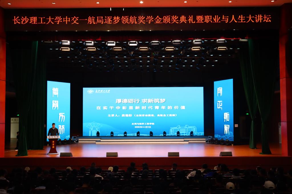 在“职业与人生大讲坛”环节,全国劳动模范段稳盼以“厚德砺行 求新筑梦:在实干中彰显新时代青年的价值”为题,结合18年扎根一线的工程实践,分享了五个职业生涯关键片段。从曹妃甸煤码头的“沉心静气”,到兰渝铁路的“磨砺成长”;从柬埔寨55号公路的“创新攻坚”,到甘肃东乡扶贫路的“为民情怀”,再到新疆木垒风电项目的“开拓突破”,他以生动详实的案例,诠释了“干一行爱一行、钻一行精一行”的劳模精神与工匠品质,为初入大学的学子们上了一堂富有感染力的专业认知与职业精神启蒙课。互动环节中,段稳盼与新生亲切交流,耐心解答同学们的疑问!