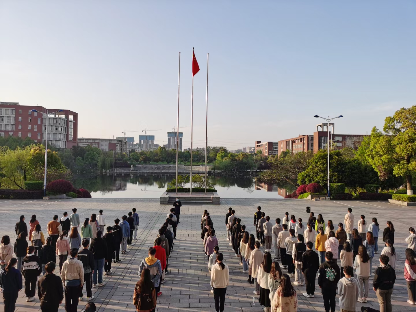 升旗仪式完毕后,学生代表朱雅婷在国旗下宣读“疫情防控,从我做起”倡议书,倡导大家落实好常态化疫情防控各项措施,戴口罩、少聚集、不扎堆;坚持每日打卡体温检测以及积极尽早做核酸,出入扫场所码;尽量做到不不点外卖、不网购快递,不私自出校、不翻越围墙,更不当校外外卖的“转运员”,一起共同抵御新冠病毒的传播!党总支书记王建辉强调学好专业知识的重要性,鼓励学生积极参加学科竞赛,积累经验,丰富大学期间的阅历。