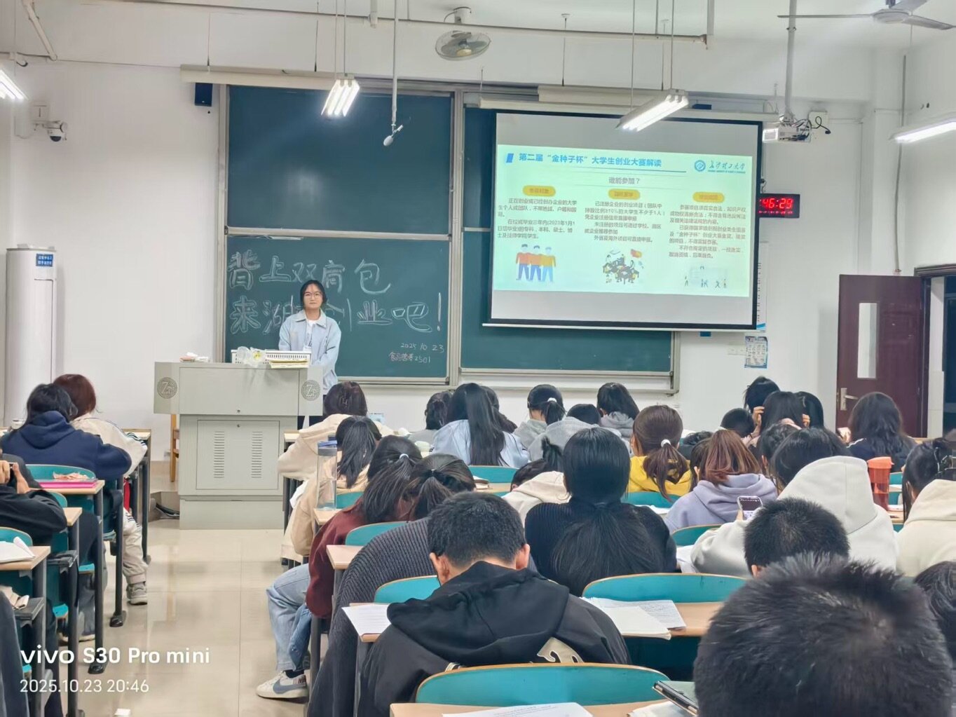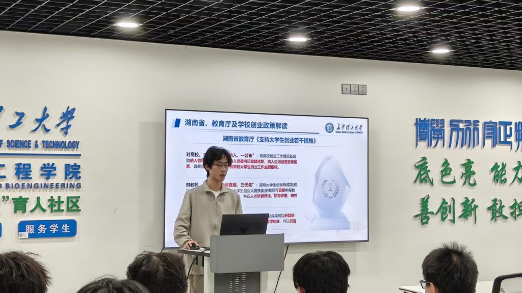 班会上,各班以PPT宣讲为主要形式,系统解读《湖南省大力支持大学生创业若干政策措施》中的“七个一”举措,详细阐释湖南省教育厅及学校相关政策中的“两直接”“三优先”“两配套”“六可以”内容,并结合食品专业特色,重点梳理与食品研发、品牌孵化相关的政策扶持方向。此外,各班还介绍了第二届“金种子杯”大学生创业大赛方案及学校创新创业园支持政策,鼓励学子结合食品行业发展趋势申报创业项目。