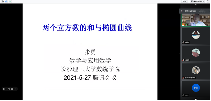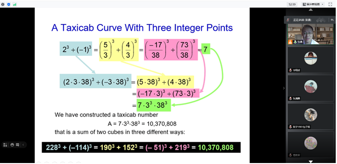 527日晚,数学与应用数学系张勇博士通过腾讯会议在线作了题为两个立方数的和与椭圆曲线的学术报告,数学与应用数学专业2019级同学参加了报告会。 张勇老师首先介绍了哈代和拉马努金的故事, 随后就正整数1729可以表示为13+123=93+103这一实例提出问题: “能否找到一个正整数,可用三种不同方式表示为两个立方数的和,引出两个立方数的和的问题。张博士从几何的角度讨论了丢番图方程x3+y3=A上点的加法运算, 并用实例说明如何用更多方式将一个正整数表示为两个立方数之和。他还介绍了Waring问题与Euler的幂和猜想,鼓励同学们多读数学史、学习经典的数学理论、思考经典的数学问题、寻找感兴趣的方向。本次讲座不仅开阔了同学们的视野, 也激发了同学们积极参与学术研究的热情。